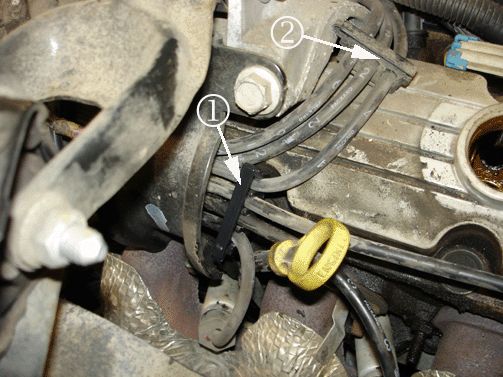 4. Install a 7mm four-wire retainer, P/N 88891792 (1) (qty 5/pack) to spark plug wire number 4, then to spark plug wires 1,3 and 5. Save the other 7mm or 8mm spark plug four-wire retainers for future repairs. Make sure that spark plug wires 2, 4 and 6 are secured to the original retainers and under the left engine mount strut bracket (2).