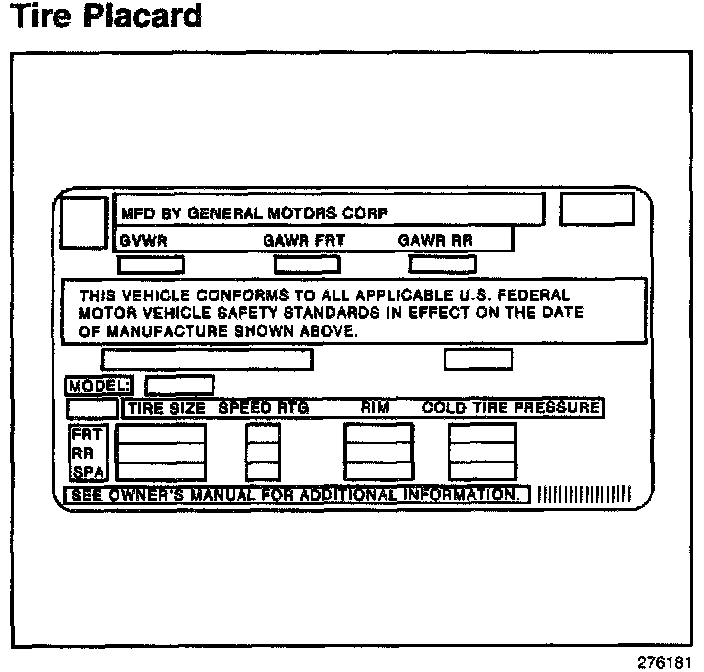 The tire placard is located on the inside edge of the driver's door. Refer to the tire placard to obtain the following information: