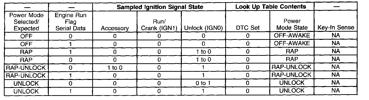 The modules that depend exclusively on serial data messages for power modes stay in the state dictated by the last valid PMM message until they can check for the engine run flag status on the serial data circuits. If the PMM fails, the modules monitor the serial data circuit for the engine run flag serial data. If the engine run flag serial data is True, indicating that the engine is running, the modules fail-safe to "RUN". In this state the modules and their subsystems can support all operator requirements. If the engine run flag serial data is False, indicating that the engine is not running, the modules fail-safe to "OFF-AWAKE". In this state the modules are constantly checking for a change status message on the serial data circuits and can respond to both local inputs and serial data inputs from other modules on the vehicle.