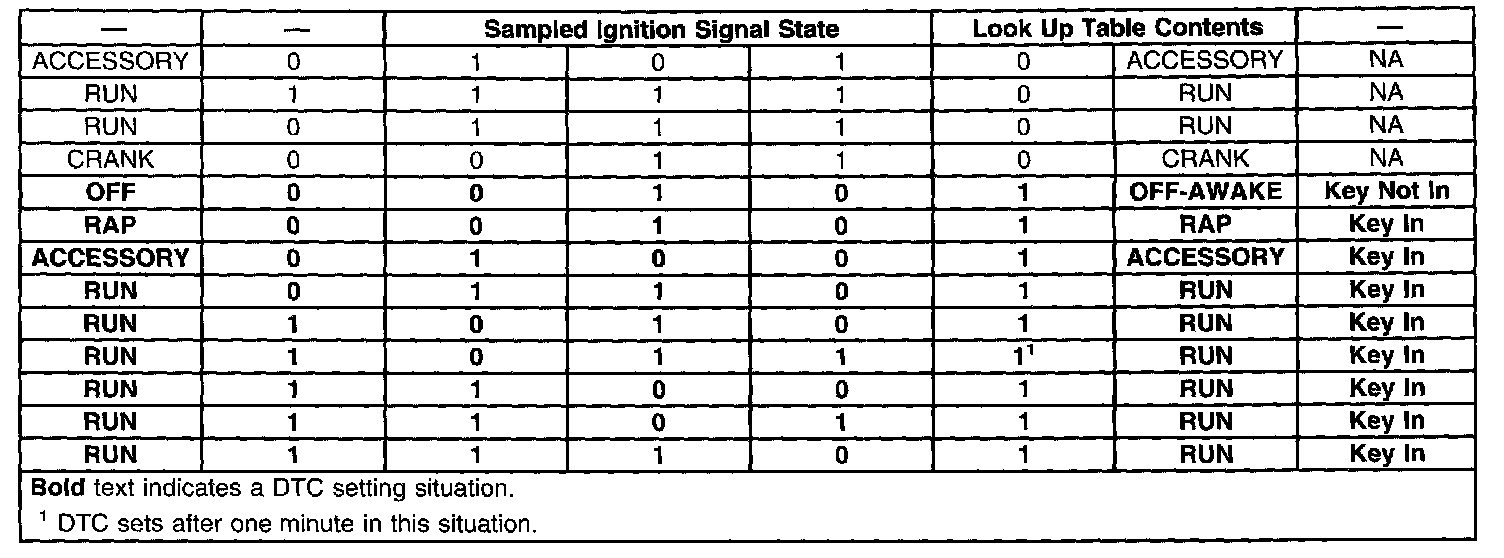 Those modules that have discrete ignition signal inputs also remain in the state dictated by the last valid PMM message received on the serial data circuits. They then check the state of their discrete ignition input to determine the current valid state. If the discrete ignition input is active, B+, the modules will fail-safe to the "RUN" power mode. If the discrete ignition input is not active, open or 0 voltage, the modules will fail-safe to "OFF-AWAKE". In this state the modules are constantly checking for a change status message on the serial data circuits and can respond to both local inputs and serial data inputs from other modules on the vehicle.