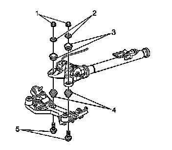 4. Remove the rear differential carrier mounting bolts (5) from the rear crossmember. Refer toDifferential Replacement in Rear Drive Axle.