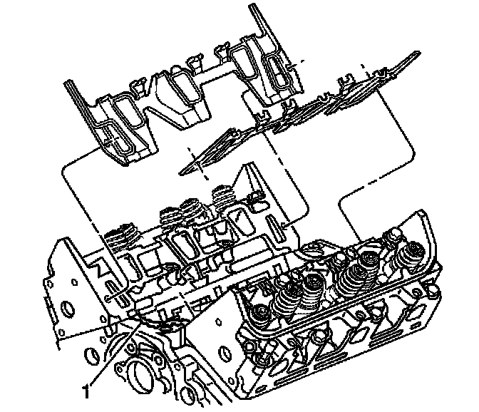 1. Apply 8 - 12 mm (0.08 - 0.11 inch) bead of RTV Sealer GM P/N 12345739 or equivalent on each ridge where front and rear of the lower intake manifold contact the engine block (1).