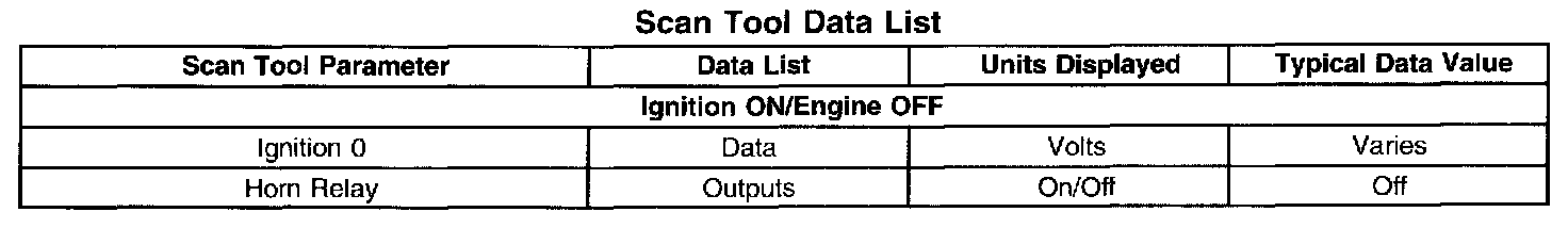 The Horns Scan Tool Data List contains all of the horn related parameters that are available on the scan tool. The parameters in the list are arranged in alphabetical order. The column, "Data List " indicates the location of the parameter within the scan tool menu selections. Use the Horns Scan Tool Data List as directed by a diagnostic table or in order to supplement the diagnostic procedures. Begin all of the diagnostic procedures with Diagnostic System Check - Horns.