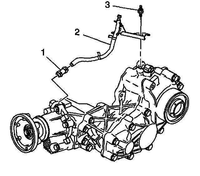3. Disconnect the vent hose (2) from the retaining bracket on the transfer case assembly.