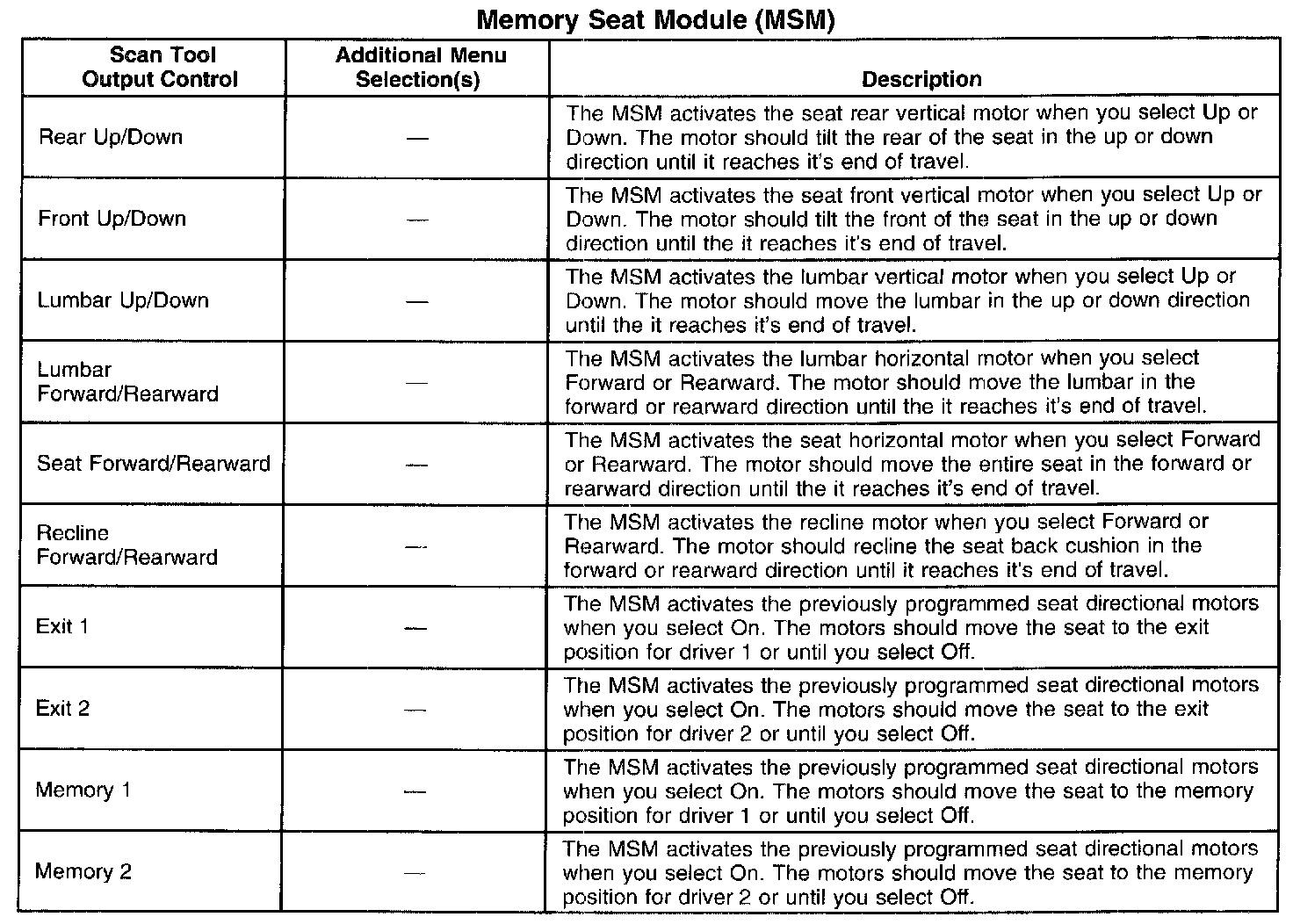 Scan Tool Output Controls - Memory Seat Module (MSM)
