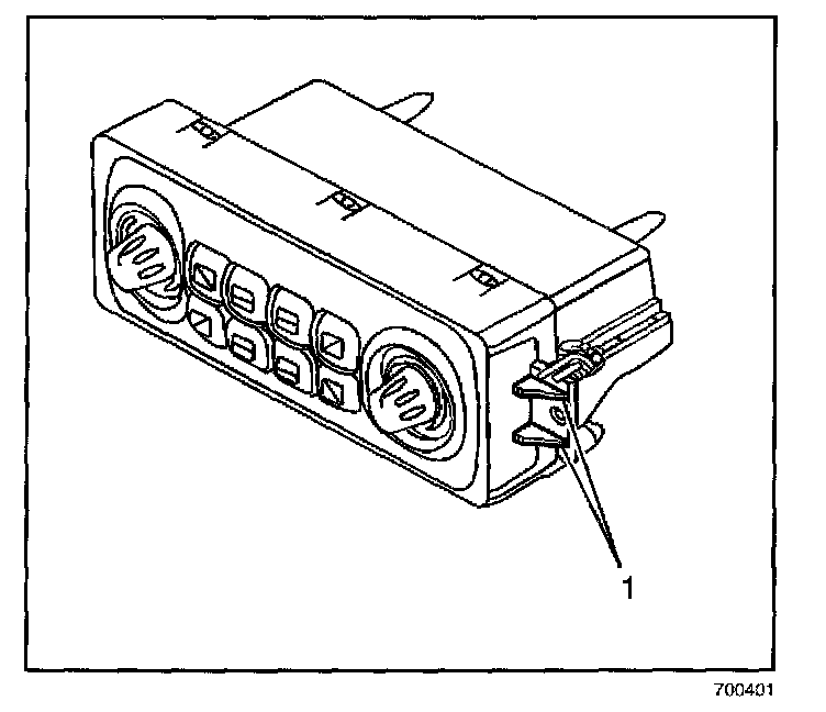 2. Pinch the tabs (1) on the control head and pull rearward on the HVAC control module to remove from the instrument panel.