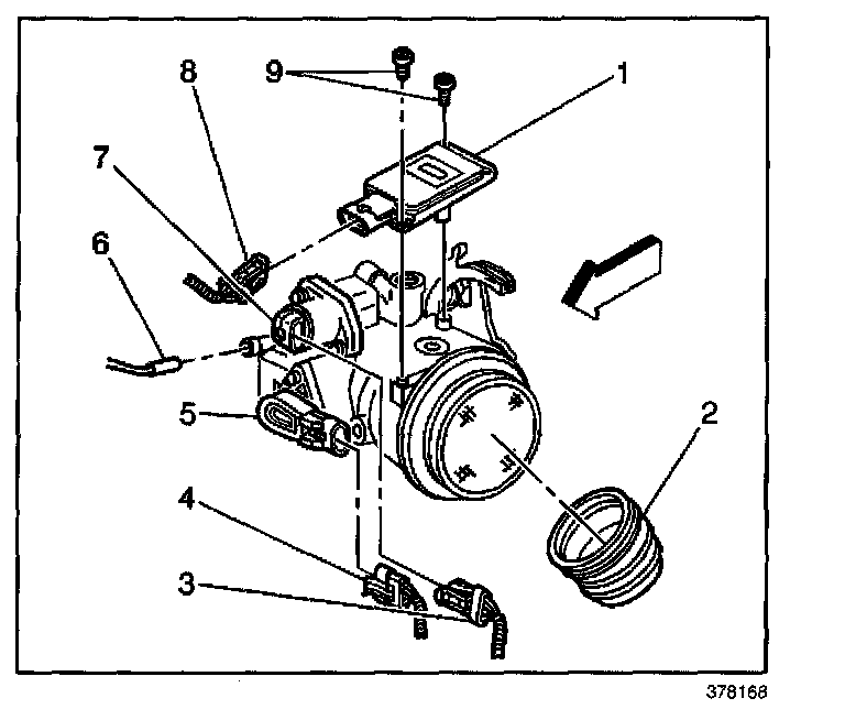 4. Remove the screws (9) that hold the MAF sensor to the throttle body.