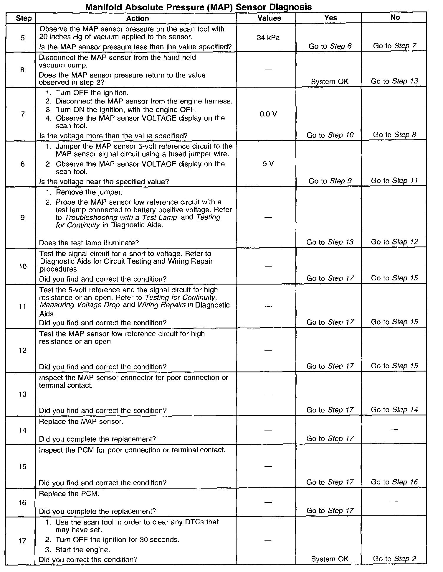 CIRCUIT DESCRIPTIONThe manifold absolute pressure (MAP) sensor responds to pressure changes in the intake manifold which gives an indication of the engine load. The MAP sensor has a 5-volt reference circuit, a low reference circuit, and a signal circuit. The powertrain control module (PCM) supplies 5 volts to the MAP sensor on the 5-volt reference circuit and provides a ground on the low reference circuit. The MAP sensor provides a signal to the PCM on the signal circuit which is relative to the pressure changes in the manifold. With low manifold absolute pressure such as during idle or deceleration, the PCM should detect a low signal voltage. With high manifold absolute pressure such as ignition ON, with the engine OFF or wide-open throttle (WOT), the PCM should detect a high signal voltage. Certain vehicle models will also use the MAP sensor in order to calculate the barometric pressure (BARO) when the ignition switch is turned ON, with the engine OFF. The BARO reading may also be updated whenever the engine is operated at wide-open throttle. The PCM monitors the MAP sensor signal for voltage outside of the normal range. If the PCM detects a MAP sensor signal voltage that is excessively high, DTC P0108 will set. If the PCM detects a MAP sensor signal voltage that is excessively low, DTC P0107 will set.