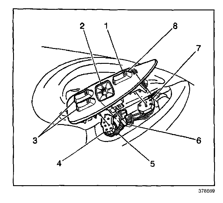 4. Remove the power door lock switch (8) from the accessory panel (1).