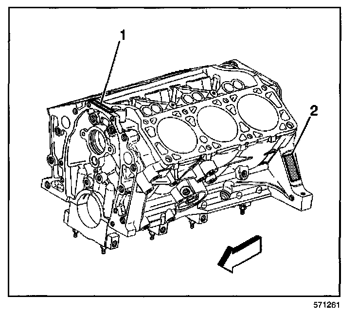 The primary location (1) of the Engine ID for the 3400 LA1 engine is on the top front of the engine block. The optional (2) location is on lower left front transaxle mounting surface.