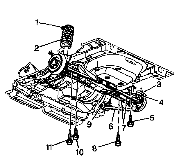 2. Install the rear suspension support mounting bolts (5, 8, 10, 11).