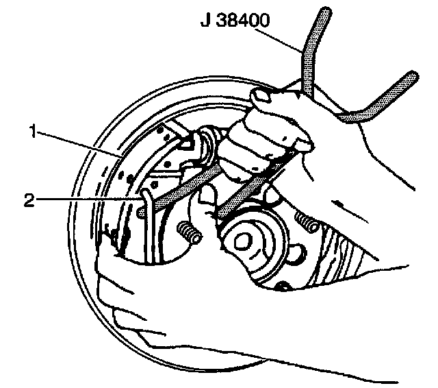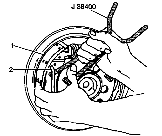 3. Position the hook end of the J 38400 under the universal spring and lightly pull the universal spring end (2) out while installing the primary shoe. Ensure that the universal spring properly engages the primary brake shoe web hole.
