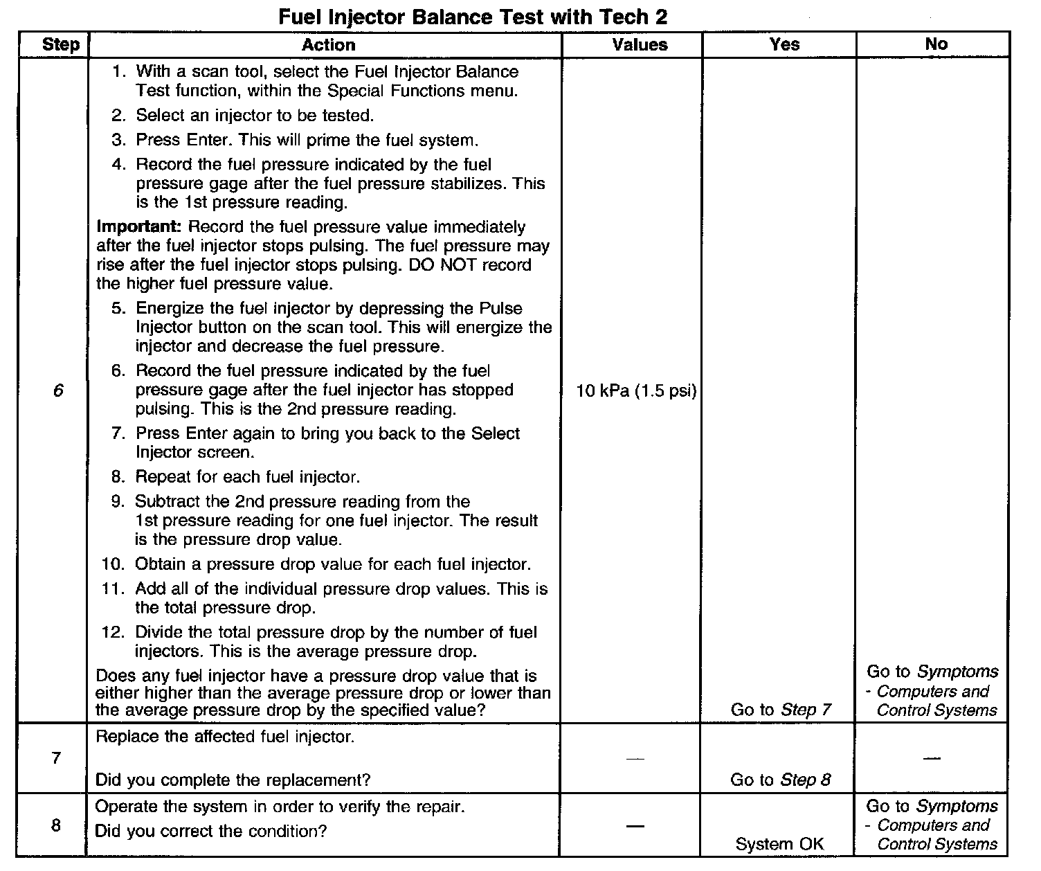 6. If the pressure drop value for each fuel injector is within 10 kPa (1.5 psi) of the average pressure drop value, the fuel injectors are flowing properly. Calculate the pressure drop value for each fuel injector by subtracting the second pressure reading from the first pressure reading.