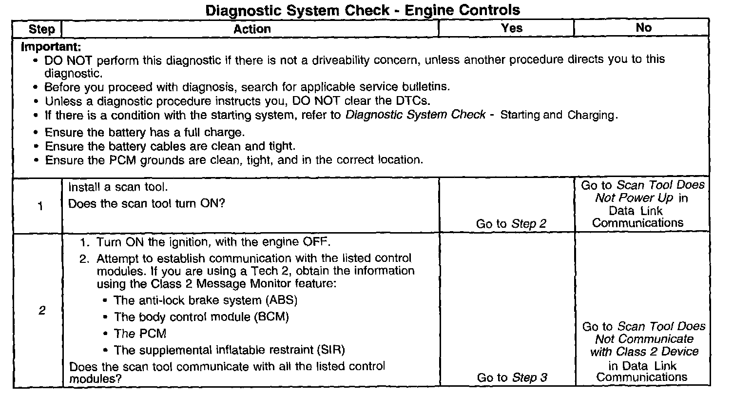 DESCRIPTIONThe Diagnostic System Check-Computers and Controls Systems is an organized approach to identifying a condition that is created by a malfunction in the powertrain control system. The Diagnostic System Check must be the starting point for any driveability concern. The Diagnostic System Check directs the service technician to the next logical step in order to diagnose the concern. Understanding and correctly using the diagnostic table reduces diagnostic time, and prevents the replacement of good parts.