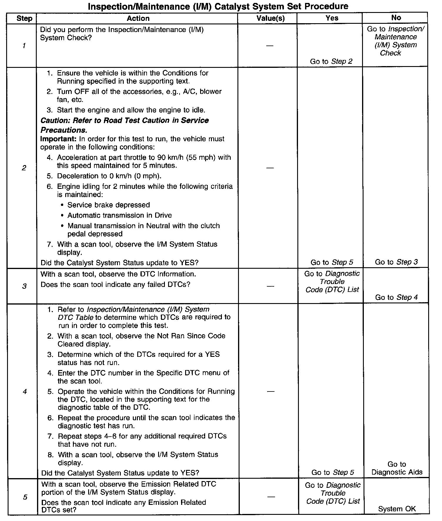 DESCRIPTIONThe purpose of this test is to satisfy the enable criteria necessary to execute I/M readiness diagnostics for the catalyst system. The test may be used to set the I/M System Status indicators to YES. Ensure the vehicle meets the requirements listed in Conditions for Running before performing this test. Failure to meet the necessary requirements may produce inaccurate test results.