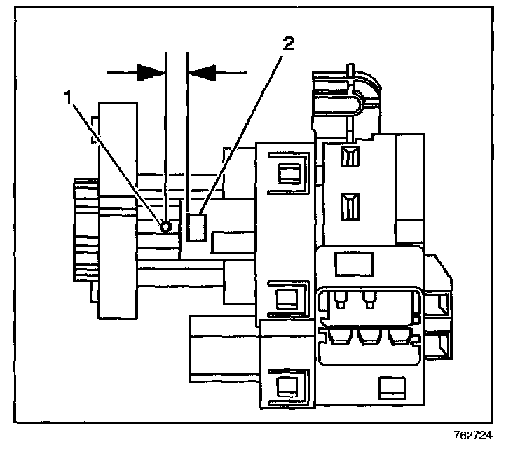 7.2. Locate the surface for the ignition switch lock cylinder release button (2) on the plastic ignition switch housing and center punch a location (1) on the rib 9.5 mm (3/8 in) rearward, toward the key entry end, from the cylinder release button.
