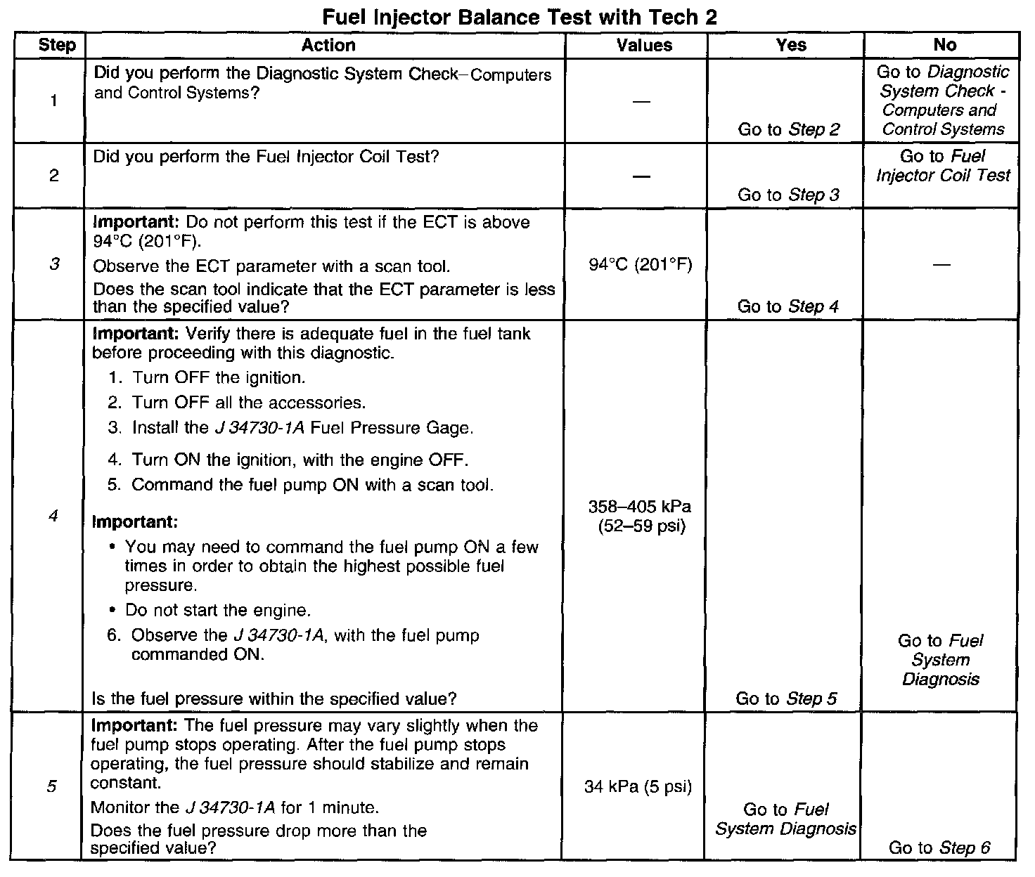 4. The fuel pressure should be within the specified range. Refer to Fuel System Diagnosis if the fuel pressure is not within the specified range. Component Tests and General Diagnostics