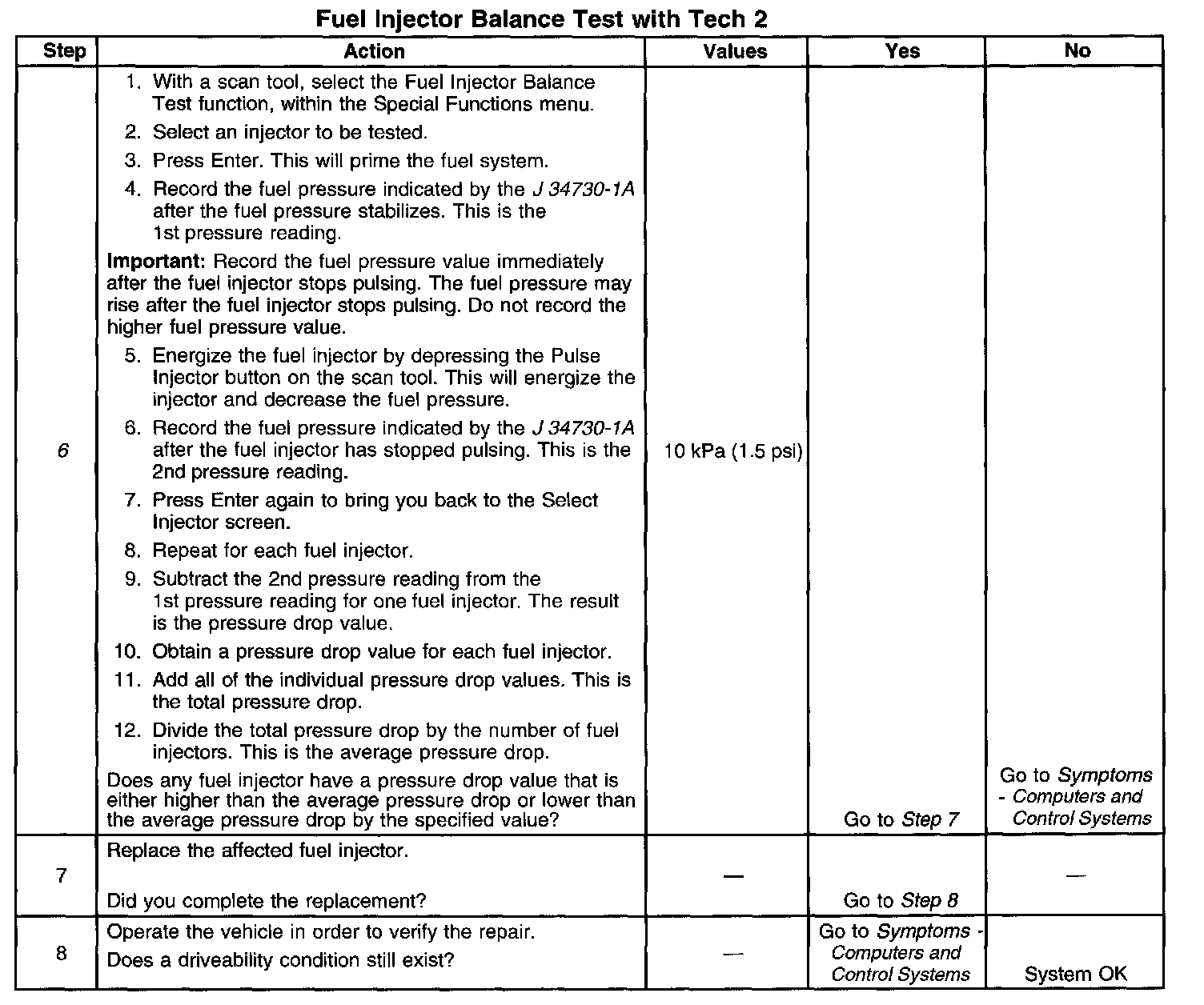 6. If the pressure drop value for each fuel injector is within 10 kPa (1.5 psi) of the average pressure drop value, the fuel injectors are flowing properly. Calculate the pressure drop value for each fuel injector by subtracting the second pressure reading from the first pressure reading.
