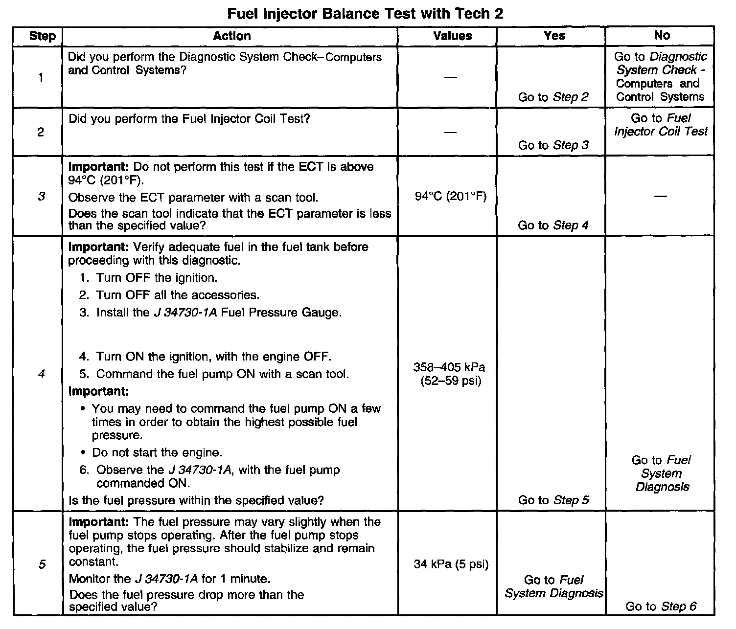 4. The fuel pressure should be within the specified range. Refer to Fuel System Diagnosis if the fuel pressure is not within the specified range. Component Tests and General Diagnostics