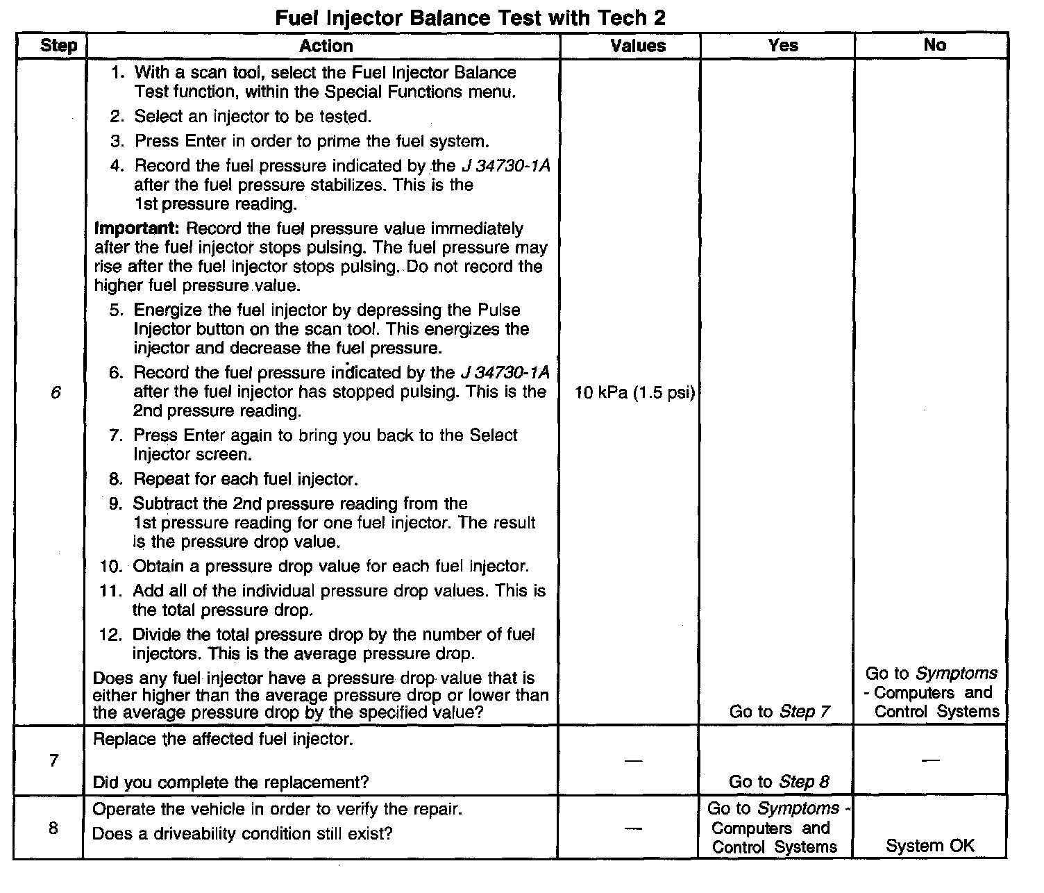 6. If the pressure drop value for each fuel injector is within 10 kPa (1.5 psi) of the average pressure drop value, the fuel injectors are flowing properly. Calculate the pressure drop value for each fuel injector by subtracting the second pressure reading from the first pressure reading.