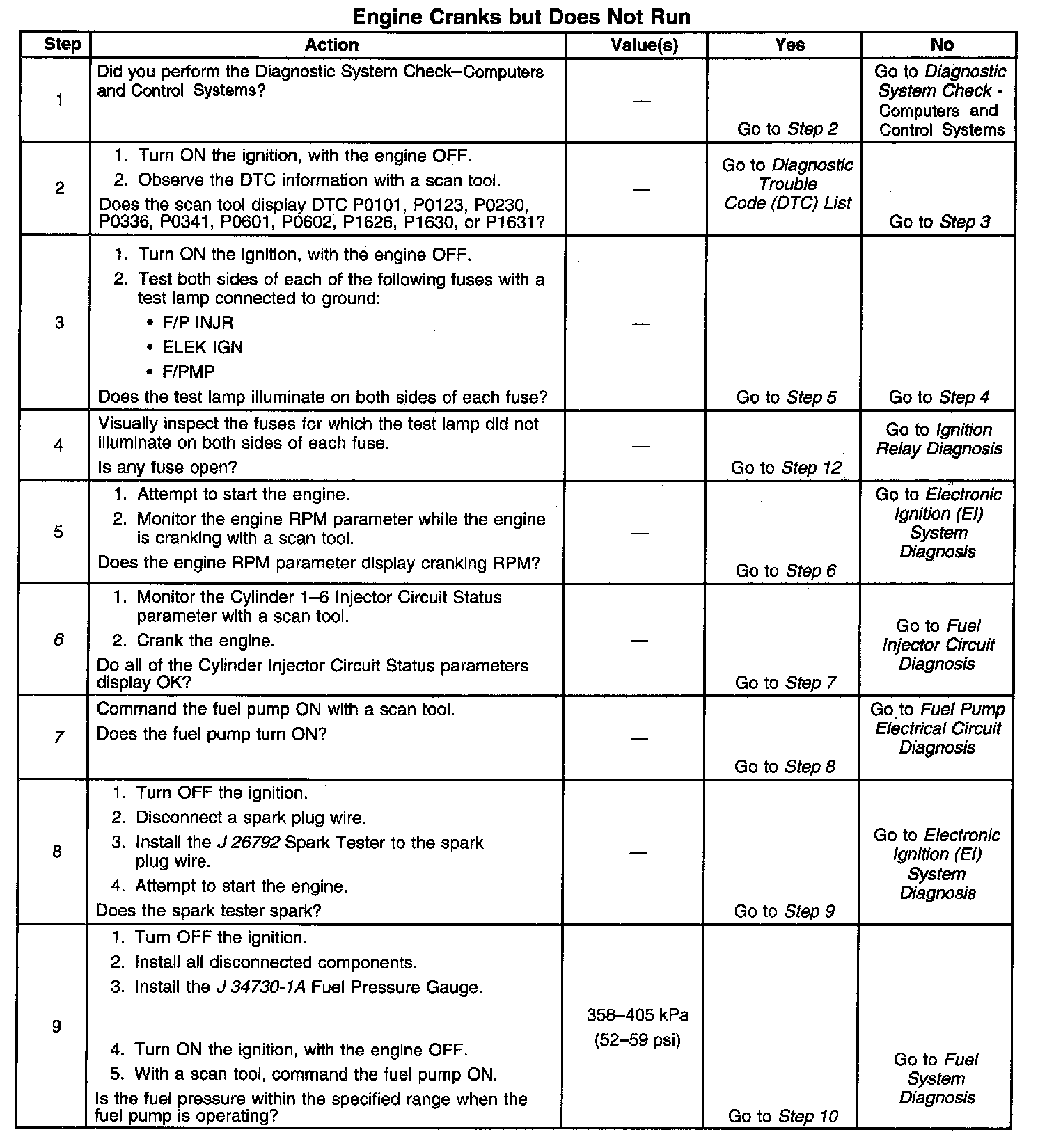 DESCRIPTIONThe Engine Cranks but Does Not Run diagnostic table is an organized approach to identifying a condition that causes an engine not to start. The Engine Cranks But Does Not Run diagnostic table directs the service technician to the appropriate system diagnosis.