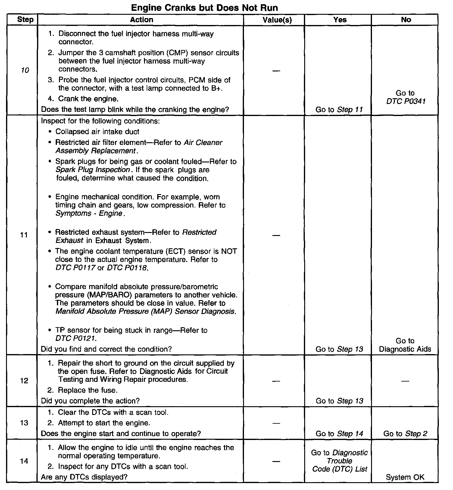 The Engine Cranks but Does Not Run diagnostic table assumes the following: