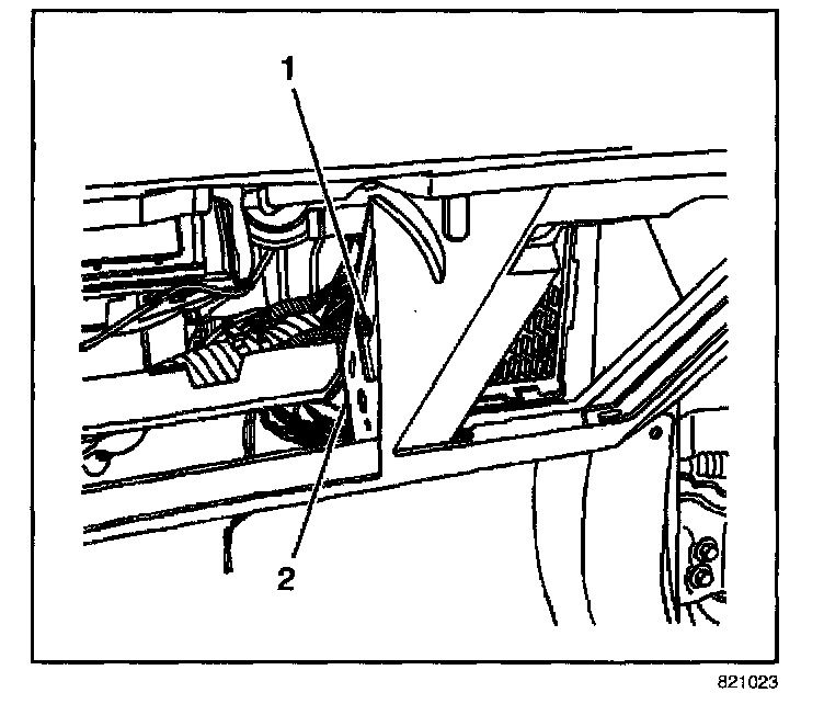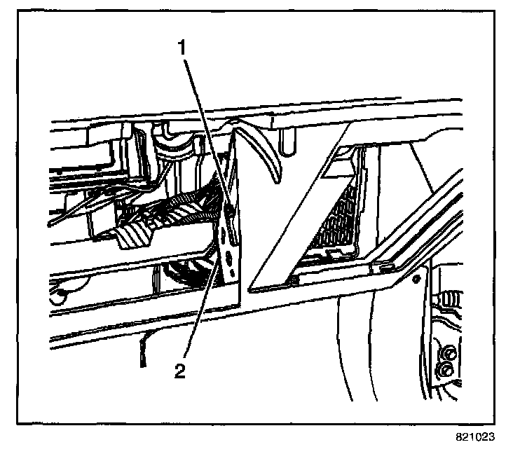 6. Disconnect the wiring harness retainer (1) from the I/P trim pad (2).