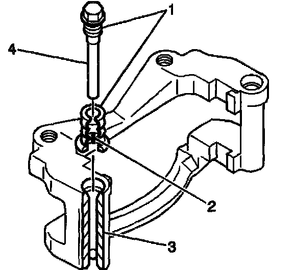 1. Lubricate the bores (3), the inside part of the bolt boot (2) and the caliper pin bolts (4) with Delphi P/N 18046532 or equivalent.
