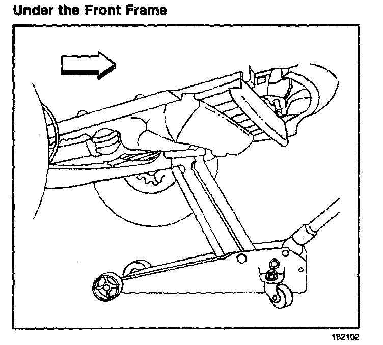 When lifting the front of the vehicle with a floor jack place the floor jack lift pad at the center of the front frame.