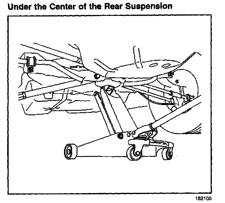Lift the rear of the vehicle by placing the floor jack lift pad at the center of the rear suspension.