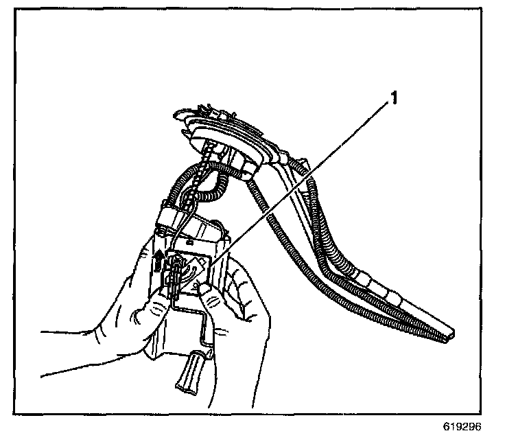5. Depress the tab on the fuel level sensor (1) while sliding up and out of the housing.