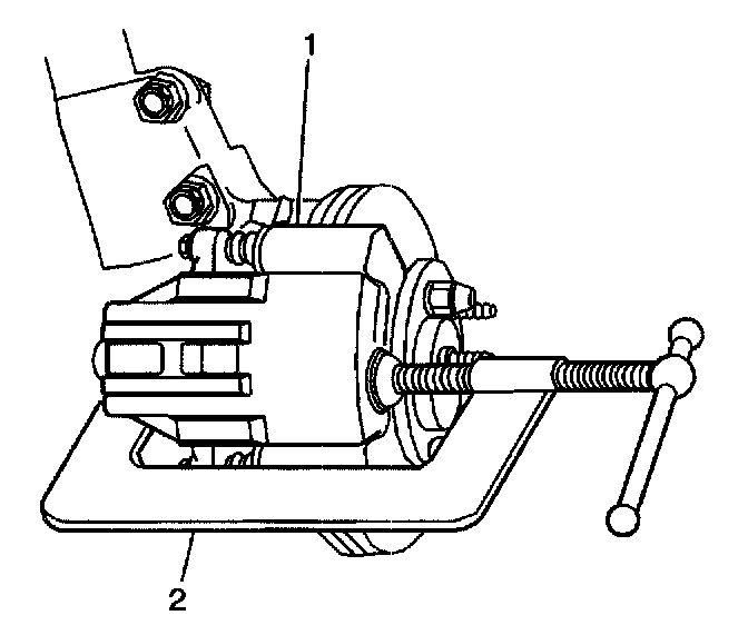 6. Install a large C-clamp (2) over the top of the brake caliper and against the back of the outboard brake pad.