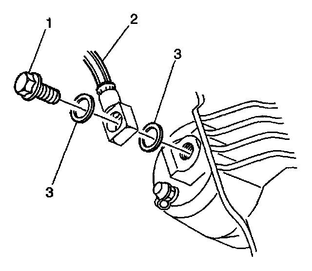 8. Assemble the brake hose bolt (1) and the NEW copper brake hose gaskets (3) to the brake hose (2).