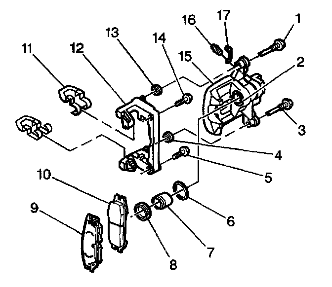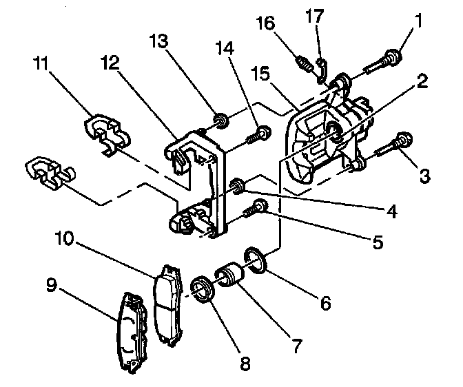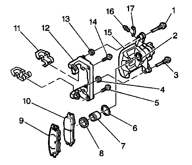 10. Remove the disc brake pad retainers (11) from the disc brake caliper bracket.