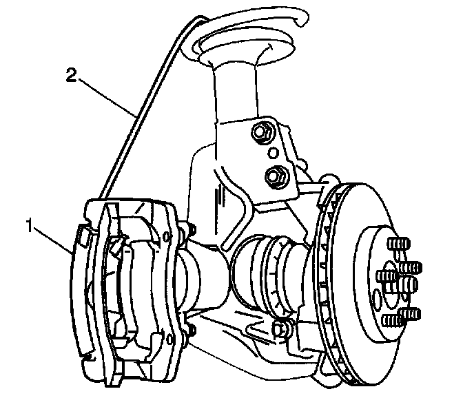 7. Use a strap (2) or heavy gage wire in order to support the brake caliper (1) and the brake caliper bracket.
