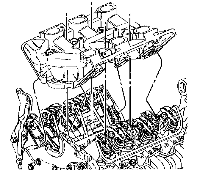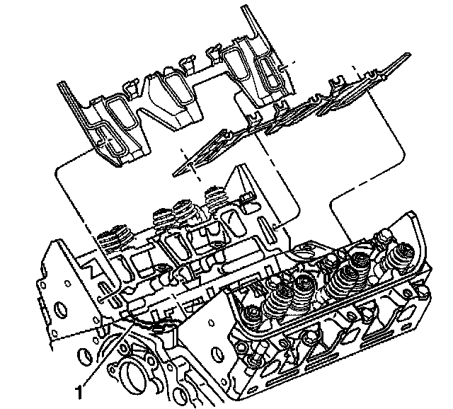 1. Apply 8 - 12 mm (0.08 - 0.11 inch) bead of RTV Sealer GM P/N 12345739 or equivalent on each ridge where front and rear of the lower intake manifold contact the engine block (1).