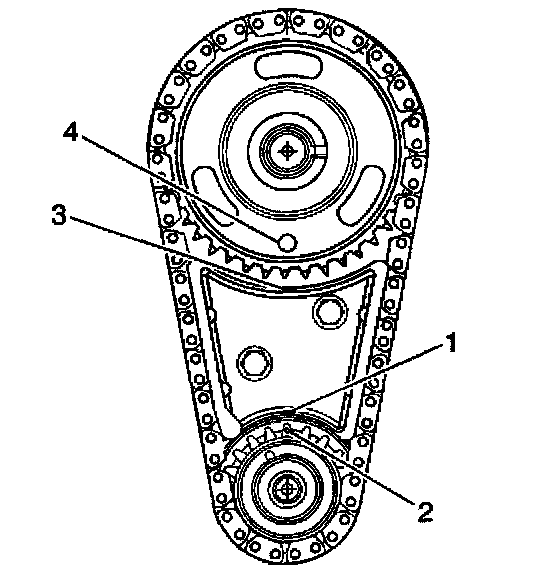 7. Align the timing mark on the camshaft gear (4) with the timing mark on top of the timing chain dampener (3).