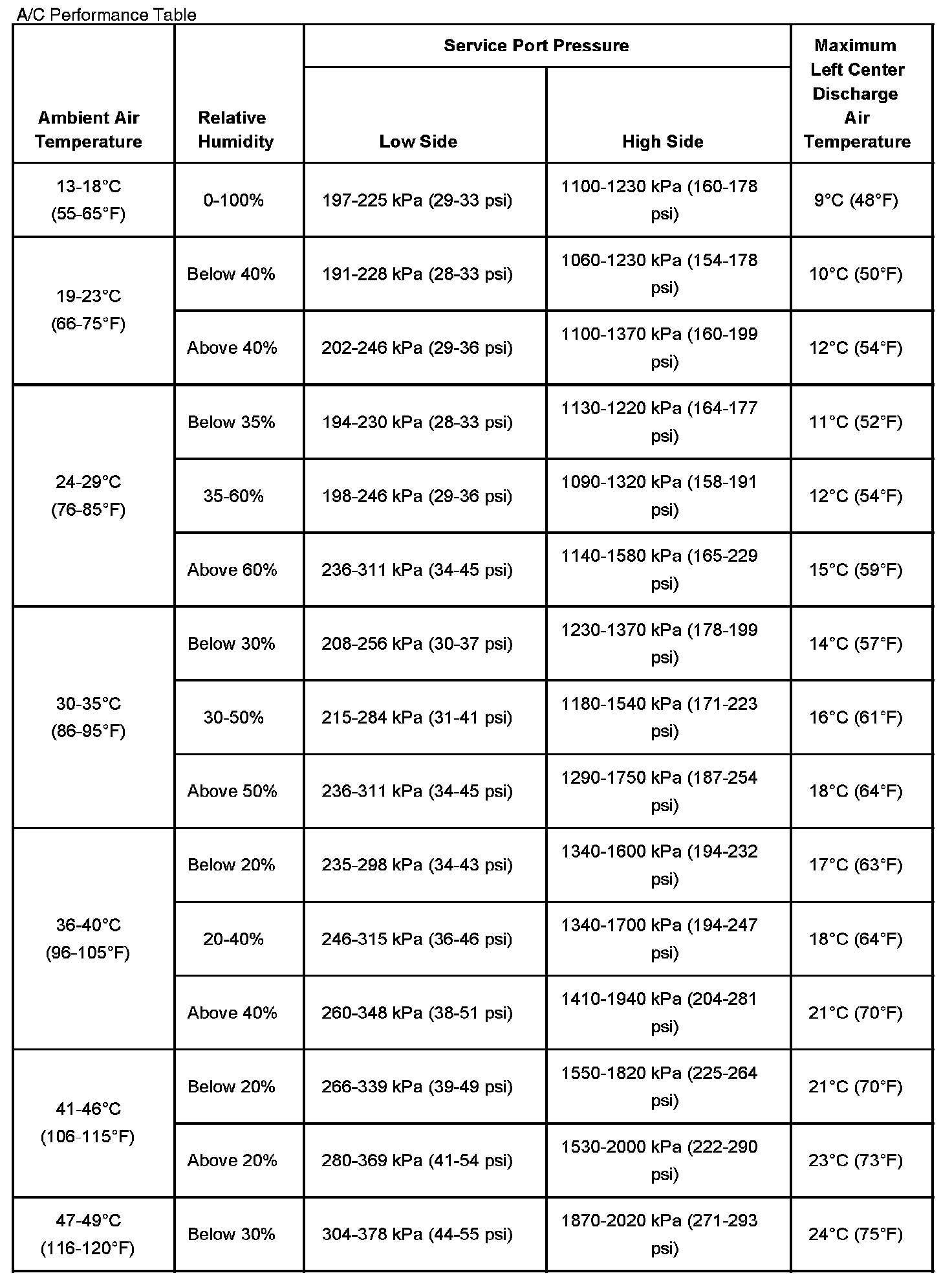 A/C Performance Table: