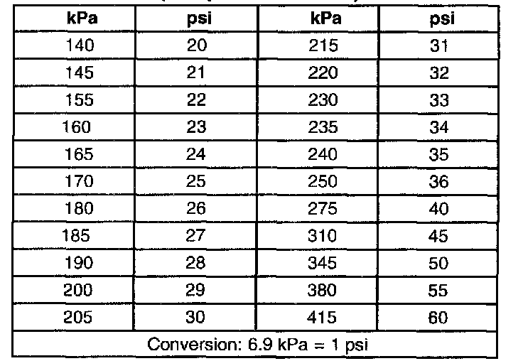 Inflation Pressure Conversion (Kilopascals to PSI)