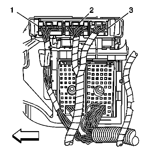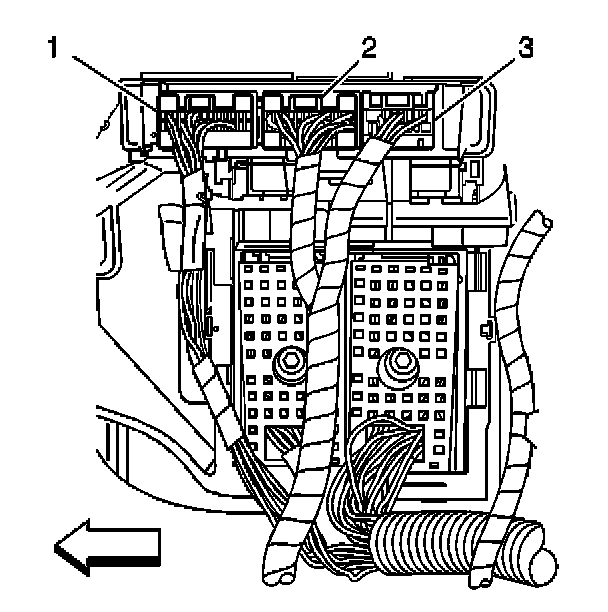 3. Disconnect the body control module (BCM) electrical connectors (1, 2, 3).