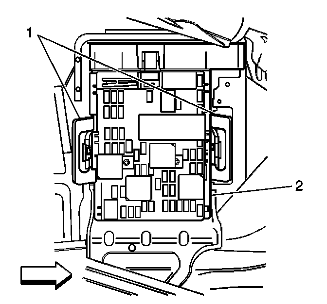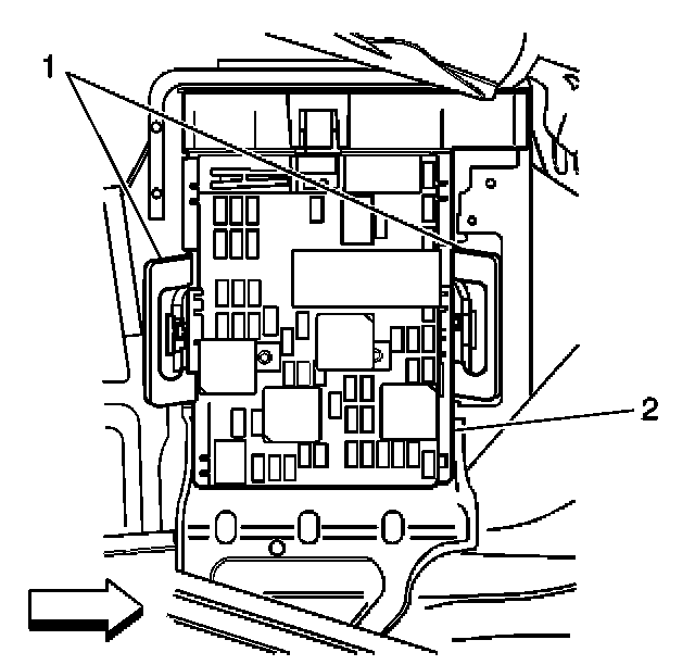 2. Install the console accessory wiring junction block (2) into the console accessory wiring junction block bracket.
