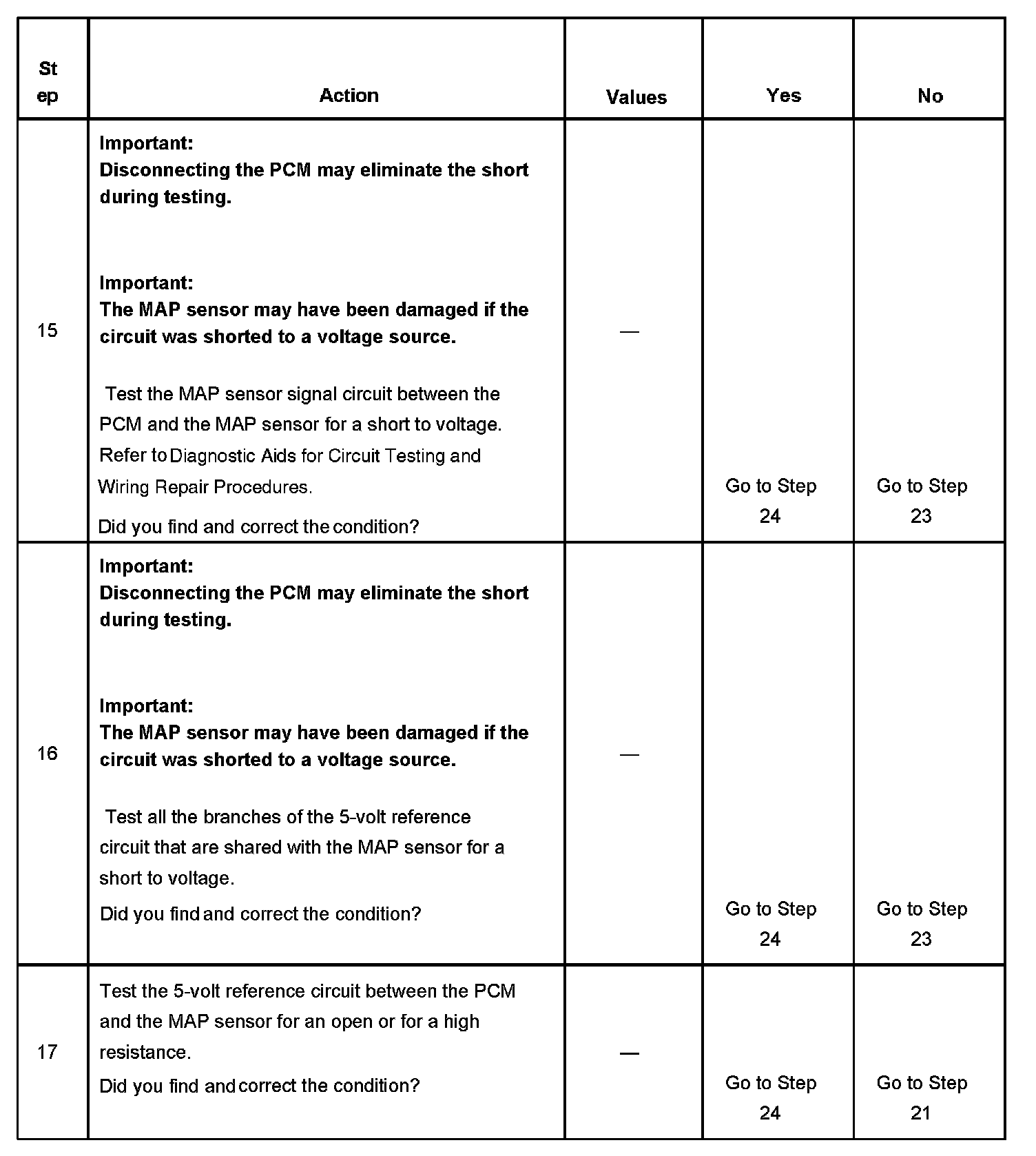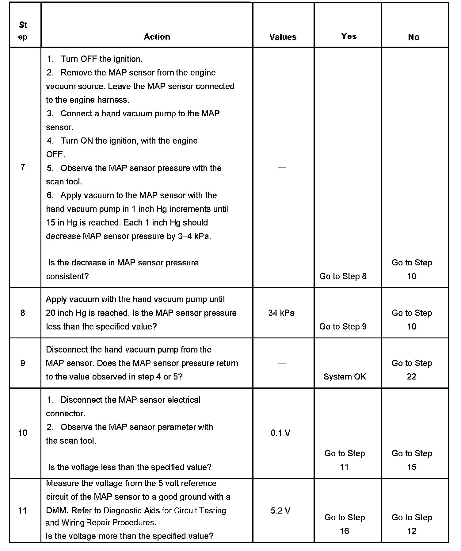 If the PCM detects a MAP sensor signal voltage that is excessively high, DTC P0108 sets. If the PCM detects a MAP sensor signal voltage that is excessively low, DTC P0107 sets
