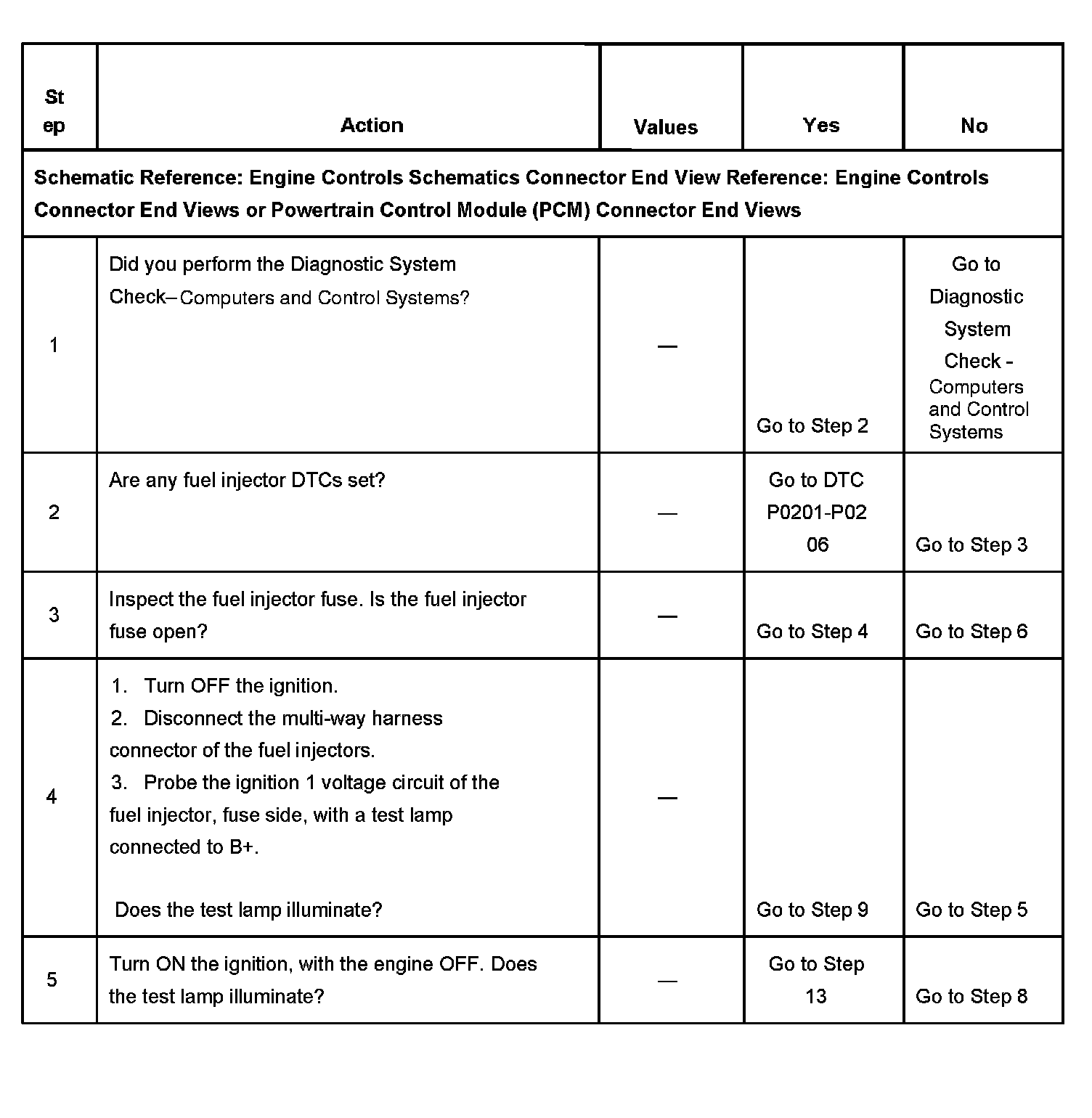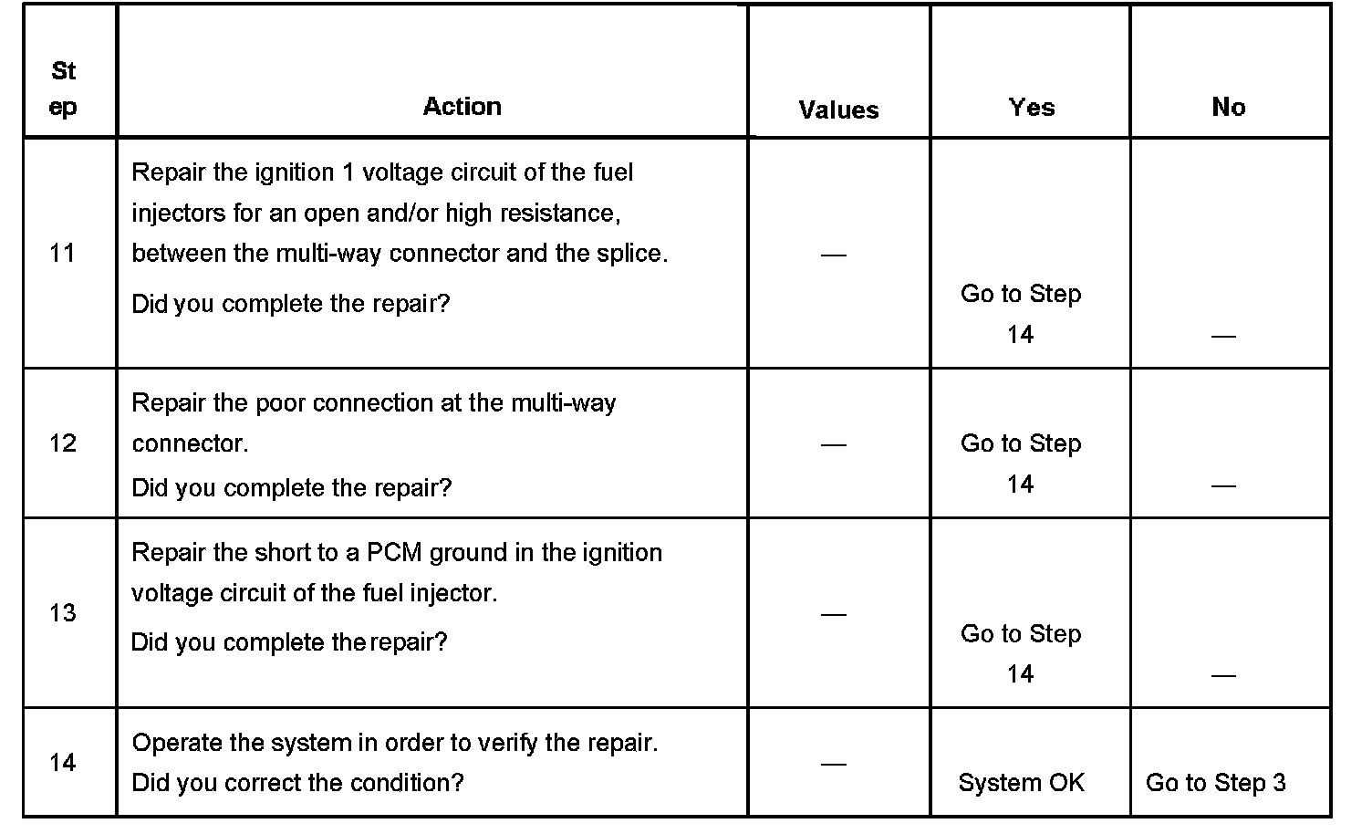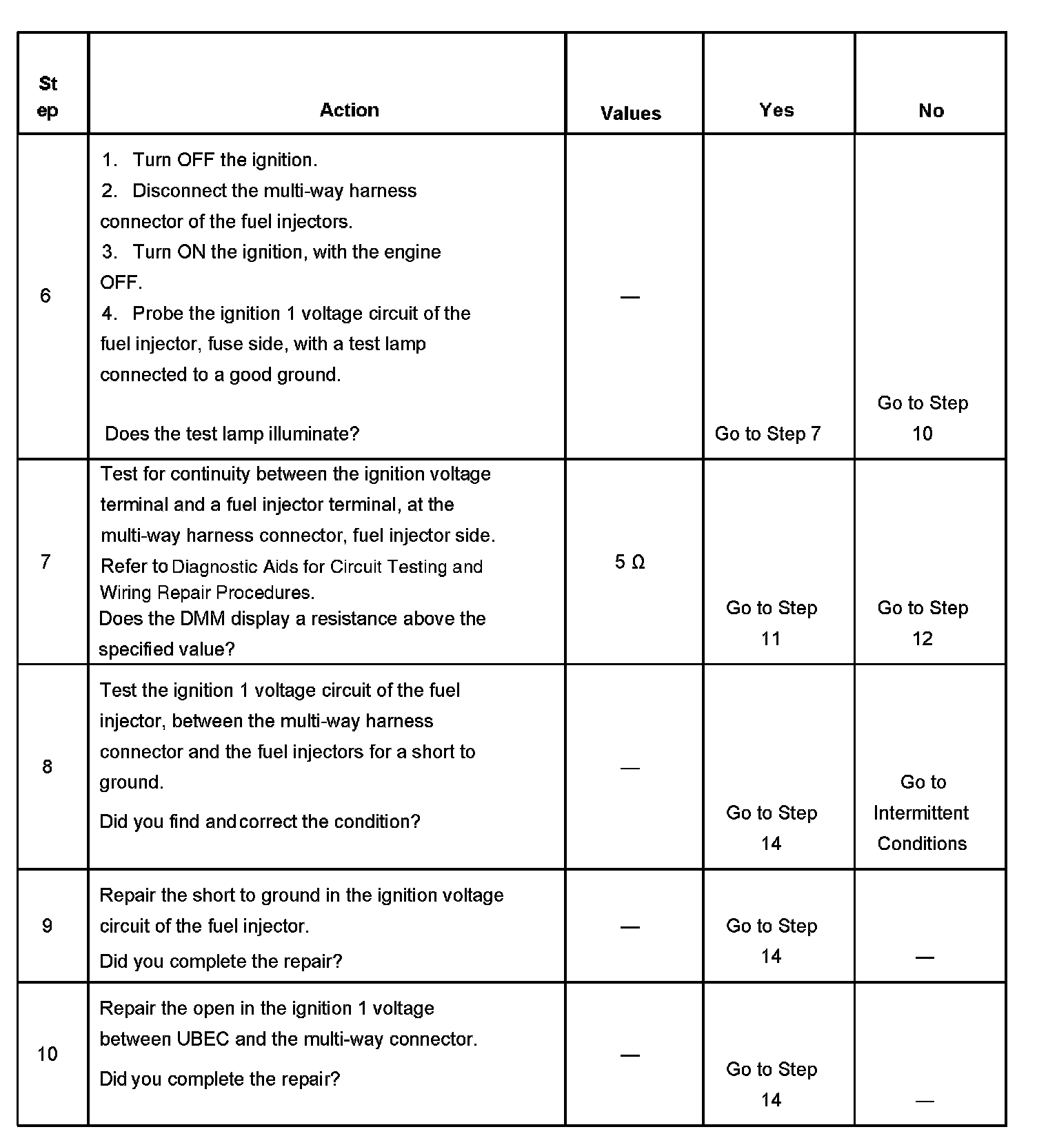 7. This step tests for an open or high resistance between the multi-way connector and the fuel injectors.