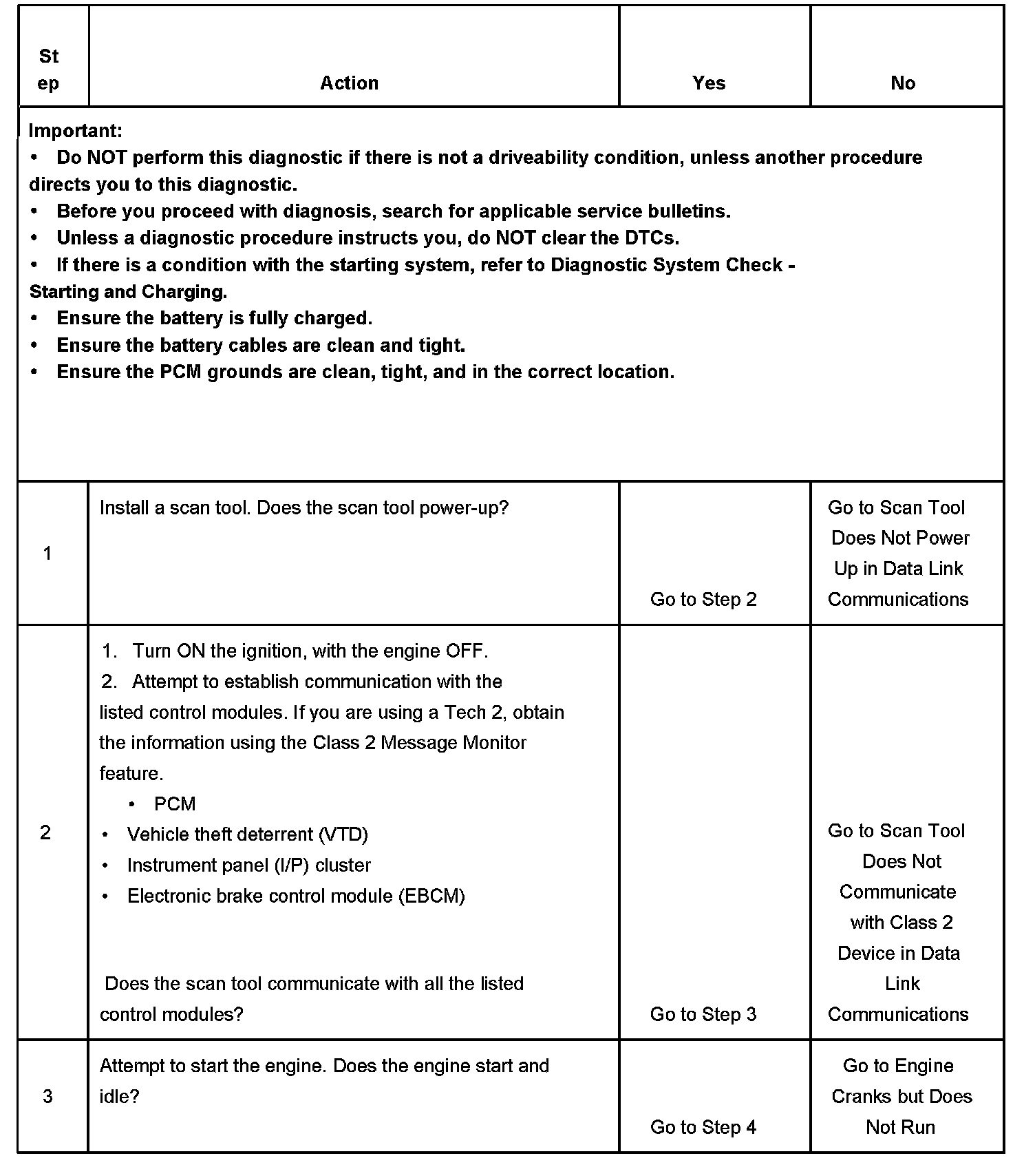 2. Lack of communication may be because of a partial or a total malfunction of the class 2 serial data circuit. The specified procedure determines the particular condition.