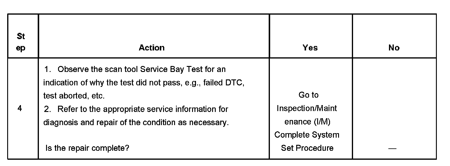 3. This step is to determine whether or not the EVAP System Test has passed. If the system is operating correctly, the scan tool indicates that the system has passed and the I/M System Status updates to YES. If the EVAP Service Bay Test aborts because of lost enable conditions, the test can be repeated once the enable criteria is met.