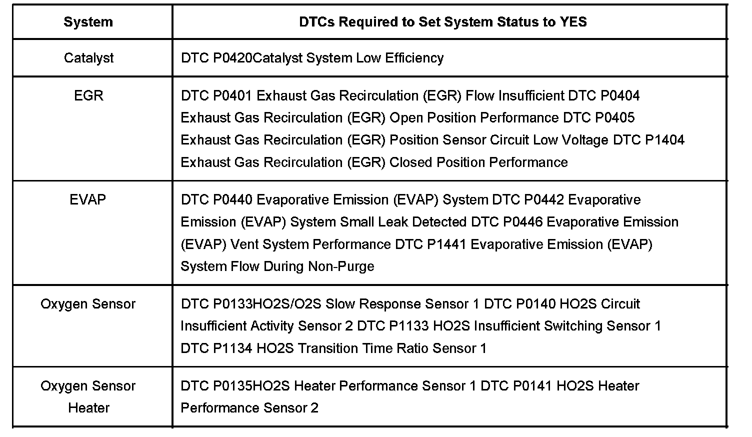 IMPORTANT: Not all vehicles will have every diagnostic trouble code (DTC) listed. For example, a vehicle may have only 2 oxygen sensors or 1 catalyst. Only those DTCs applicable to the vehicle are required to update each System Status to YES. Refer to determine which DTCs are supported for each vehicle.
