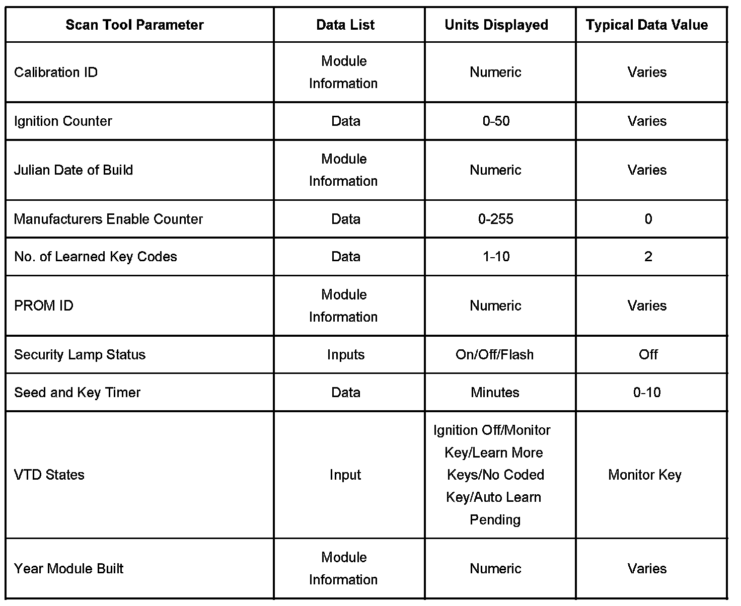 Vehicle Theft Deterrent Scan Tool Data List Part 1: