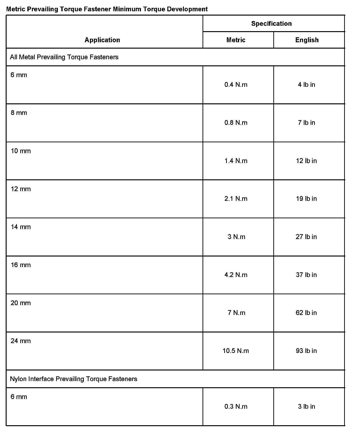 METRIC PREVAILING TORQUE FASTENER MINIMUM TORQUE DEVELOPMENT