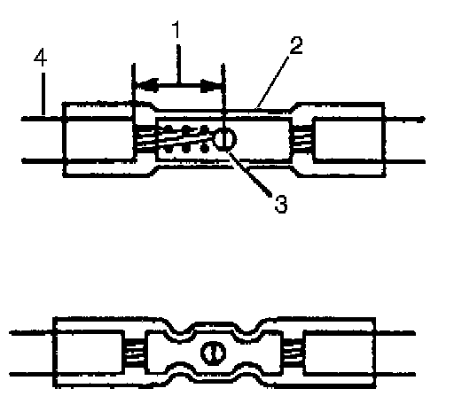 - Strip approximately 7.5 mm (5/16 in) of insulation from each wire to be spliced (1).