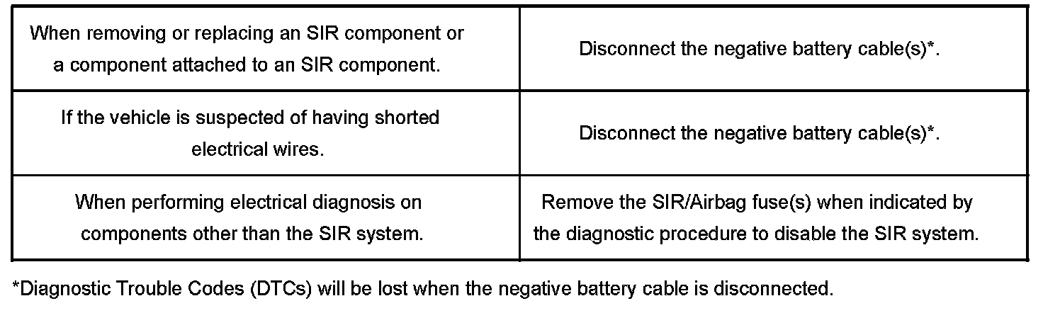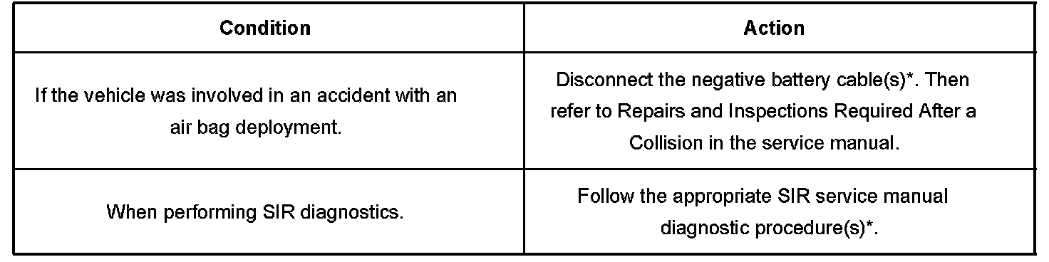 When performing service on or near the SIR components or the SIR wiring, the SIR system must be disabled. Failure to observe the correct procedure could cause deployment of the SIR components. Serious injury can occur. Failure to observe the correct procedure could also result in unnecessary SIR system repairs.